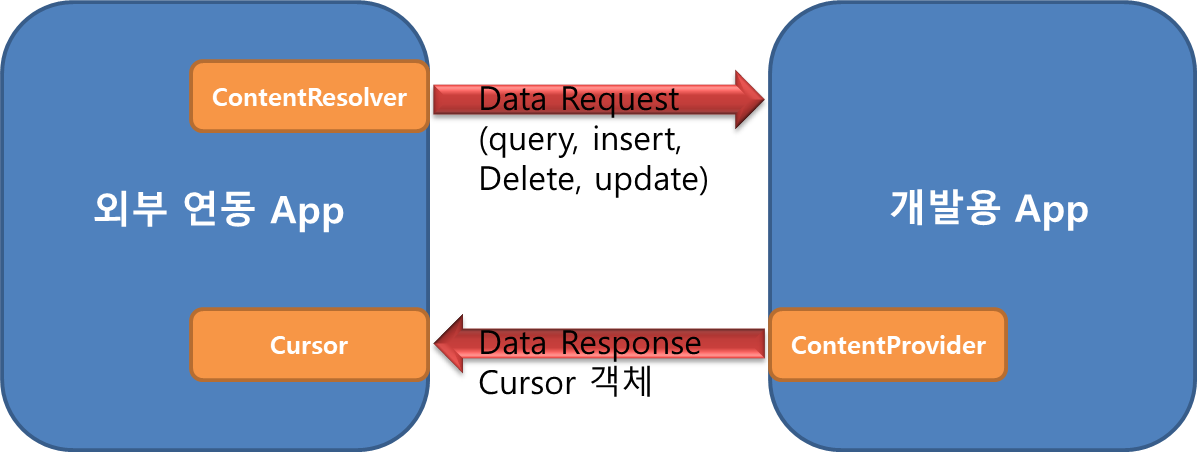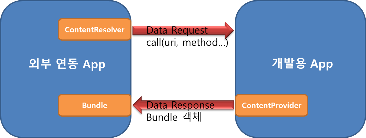 하지만 본 포스팅에서는 기존의 방식이 아닌 좀 더 유연하게 외부 연동에 대응하며, 불필요한 데이터베이스 사용을 지양하기 위해 아래와 같이 메서드 콜 방식의 Bundle 객체를 제공해주는 방식으로 ContentProvider를 사용해보고자 한다.