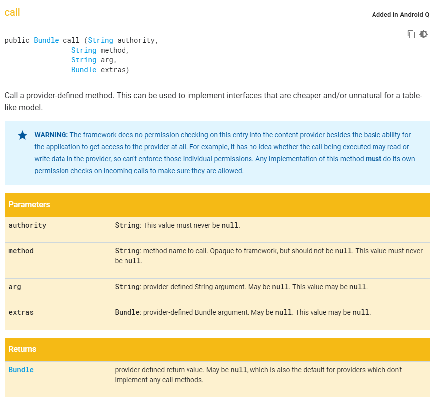 ContentProvider의 API 중 call API의 경우 상세 스팩은 아래와 같다.